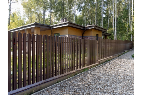 Ограждение такого типа визуально обладает легкостью, оно продуваемо, не обладает парусностью, оставляет участок частично открытым, но при этом максимально защищенным.